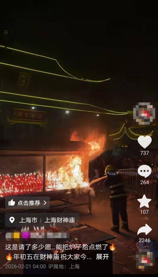 2月21日,大年初五。网友发视频反映,上海财神庙迎来了许多许愿的人,他们从20日晚上就开始排队。还有视频显示,该庙院子里一个点满香烛的炉子中,一大片蜡烛烧了起来,部分炉体被烧着,消防员正在灭火。“这是请了多少愿,把炉子都烧着了。”网友说。